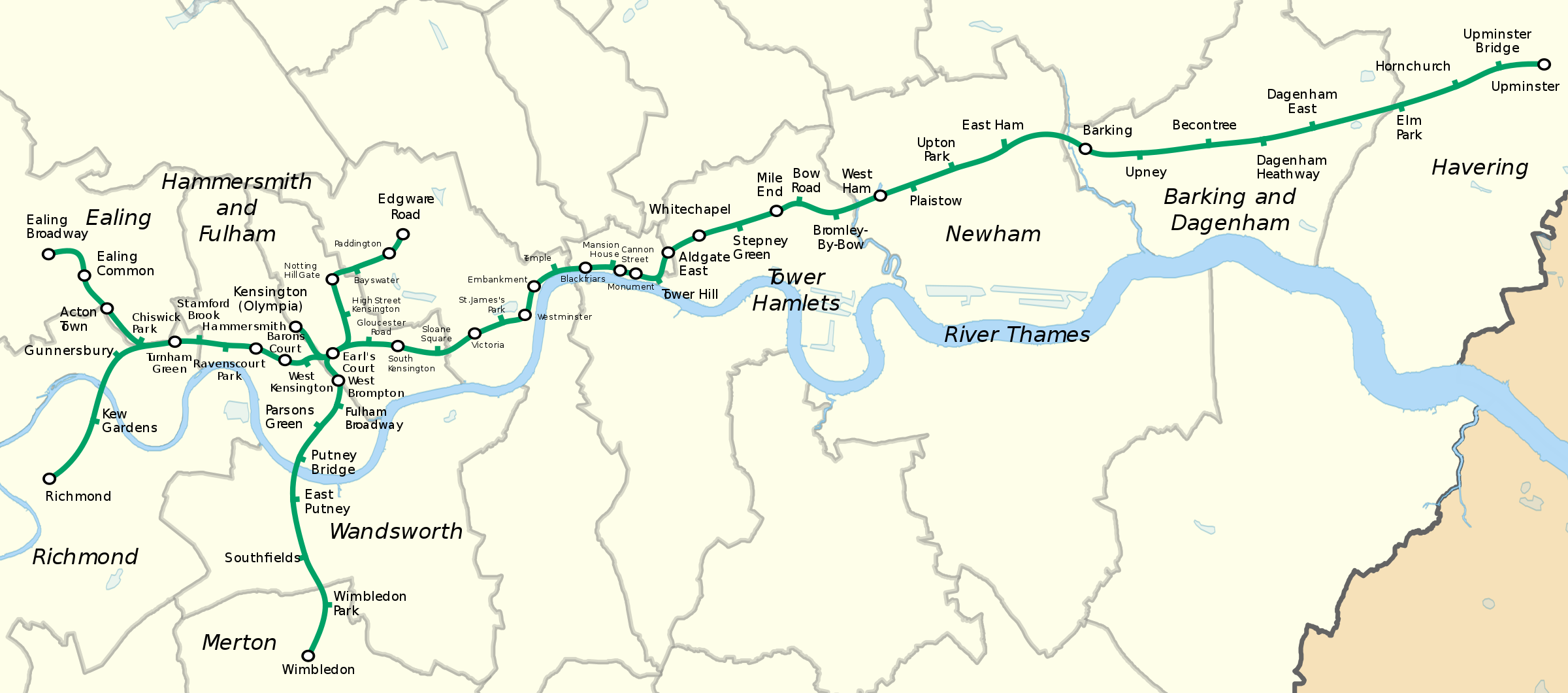 The District line is a line of the London Underground, coloured green on the Tube map. It is a "sub-surface" line, running through the central area in shallow cut-and-cover tunnels. It is the busiest of the sub-surface lines and the third busiest overall on the Underground network. Out of the 60 stations served, 25 are underground. Two of the four (Richmond and Wimbledon) western branches of the route are also the only lines across the entire network to cross the Thames by bridge and not by tunnel. Although the District line is only the fourth longest line on the network, it serves more stations than any other line.