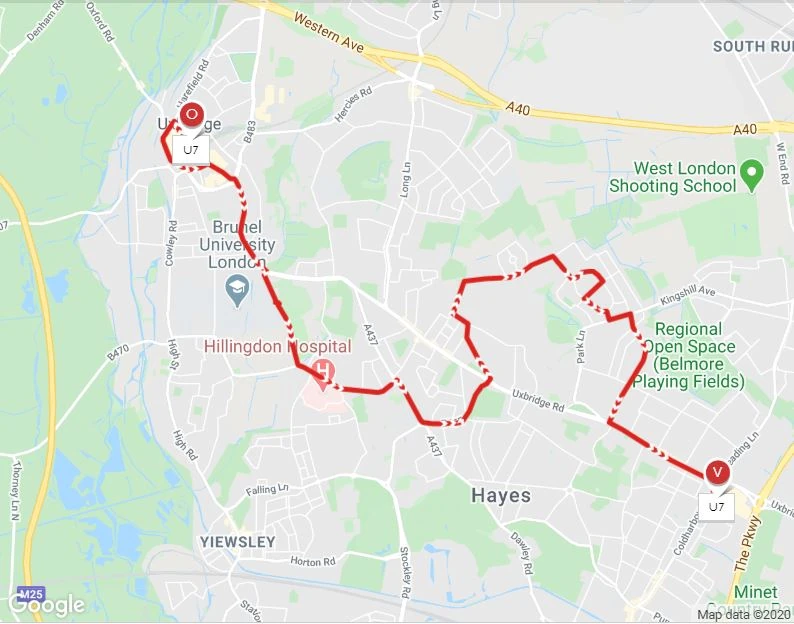 Route U7 replaced the former circular route 207A except that U7 was not ran by Metrobuses and it doesn't follow route 207 or goes via Lansbury Drive to Uxbridge. But instead goes via Hillingdon Hospital. Route U7 was operated by Wing's, ran from the Hayes garage, using Dennis Dart SLF/East Lancs Spryte. Wing's Darts didn't carry any fleet numbers and the Darts carried a yellow livery. Tellings-Golden Miller was once bought by Travel London. U7's Darts were sent all over the place and route U7 had to settle with the buses from other routes at the Hayes garage. First the Darts were painted full red and then sent to the Beddington garage for route 152. Route 152 gained Alexander Dennis Enviro200 Dart 10.2m, the Darts were then given to Fulwell temporarily for the Kingston University shuttle bus (KU)1 and their Dennis Trident 2 9.9m/ Alexander ALX400 buses were given to Battersea for route 452, while they were waiting for new Alexander Dennis Enviro400's 10.1m. Early August 2009, Route U7 was extended to Hayes Sainsburys.
