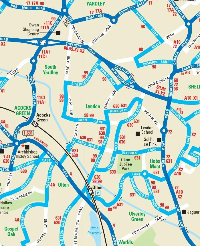 However, in January 2025 the A12 and A15 were replaced by services 630 and 631, both running the old A12 route from Solihull via Sharmans Cross and Kineton Green Road, then 630 also via Thurlston Avenue (and continuing beyond Acocks Green via Shirley Road as far as Robin Hood Island), and 631 additionally serving Castle Lane, Summerfield Rd, Hobs Moat and Ulleries Road, although only running between 9am and 3pm. These changes resulted in an improved service to most of Lyndon Road, to Thurlston Avenue and Pierce Avenue, but saw the withdrawal of buses from Wagon Lane, whilst Woodcock Lane North and Gilbertstone Avenue lost their link to Acocks Green. Operation of the A9 saw a change from Stagecoach to Diamond in November 2025 ahead of the A9 being renumbered 99, and supplemented as far as Lyndon by new service 98 which also largely replaced NXWMs withdrawn Solihull to Heartlands Hospital via Old Lode Lane service 73, from January 2026. Together the new services provided an improved 15 minute Mon-Sat, and hourly Sunday, service between Solihull and Gilbertstone Avenue, with the 98 then using Marcot Road to pick up the Coventry Road to Sheldon and thereafter the remainder of the withdrawn 73 route to Heartlands Hospital.