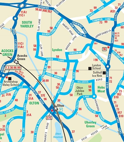 The Lyndon area has seen an awful lot of changes to its bus services over the years. Lyndon itself is an electoral ward within Solihull MBC. It is not widely used as a place name, but for the purposes of looking at historical bus service provision here we are considering the areas of Olton and adjacent districts bounded by Coventry Road to the north, Warwick Road and Dovehouse Lane to the south, Hobs Moat Road to the east and Yardley Road to the west. The corners of this area constitute the four localities bus services through Lyndon can connect to, namely Acocks Green, Yardley (Swan), Sheldon and (toward) Solihull, with the first pair of these historically presenting the opportunity for onward connection to Birmingham.